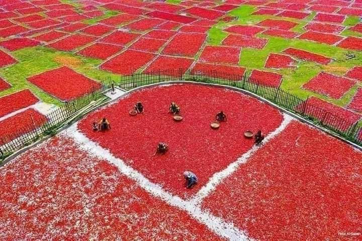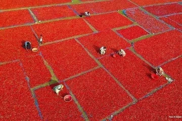 সবুজের বাংলাদেশে সবকিছুই সবুজ হতে হবে এমন তো কোনো কথা নেই। তারই প্রমাণ সরূপ মরিচ শুকানোর দৃষ্টিনন্দন দৃশ্য। সবুজের বুক ছিড়ে টুকরো টুকরো লাল!